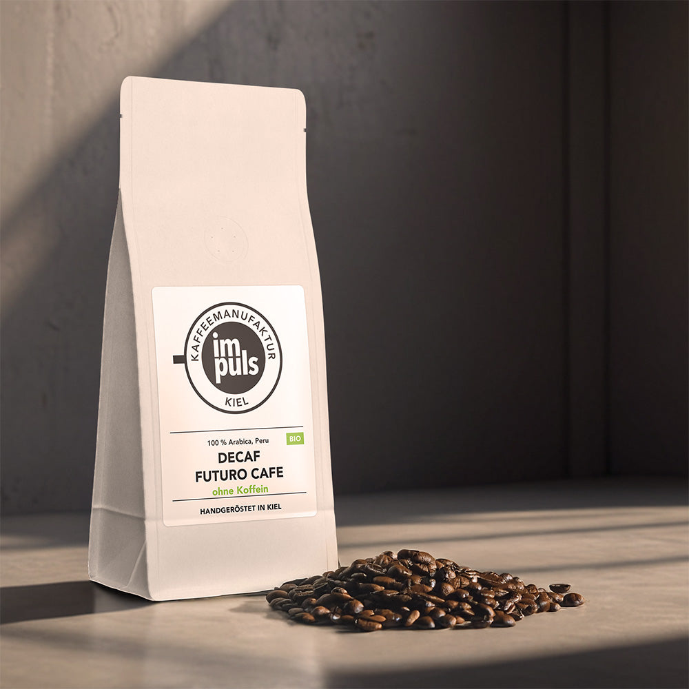 Unser Decaf Futuro bietet vollen Genuss ohne Koffein – 100% Bio-Arabica, schonend entkoffeiniert mit dem Water-Decaf-Verfahren. Mit Noten von dunkler Schokolade, Nougat und Mandarine entfaltet er ein komplexes Aromaprofil, ideal als Espresso oder Filterkaffee.